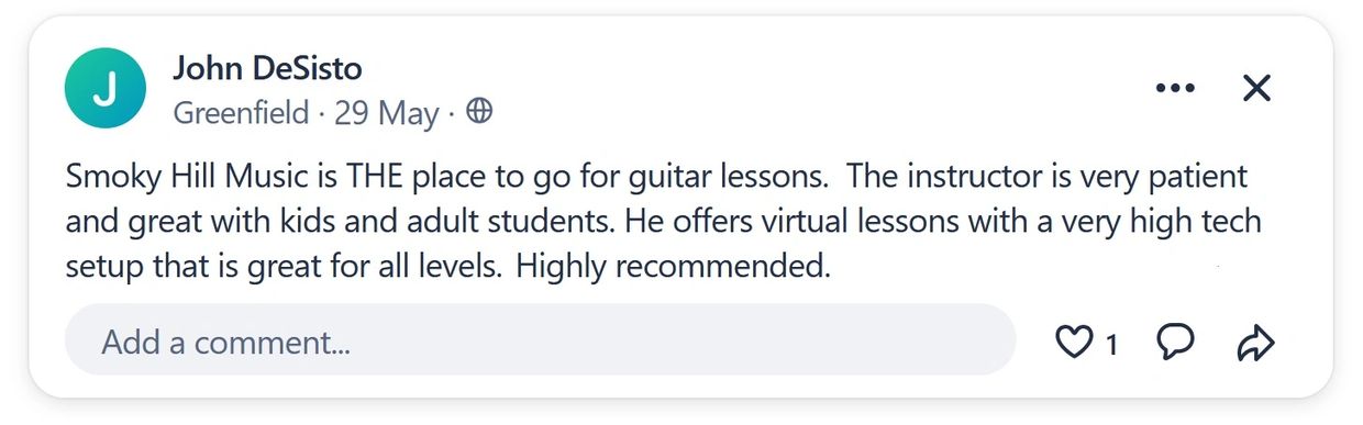 "Smoky Hill Music is THE place to go for guitar lessons. The instructor is very patient and great with kids and adult students. He offers virtual lessons with a very high tech setup that is great for all levels. Highly recommended."