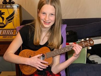 "I love playing ukulele. He has been helping me learn lots of songs and a lot about chords and tab. I’ve been learning for about a year now. He has me challenge myself and learn new things about music. We work hard and have lots of fun!" - Keila