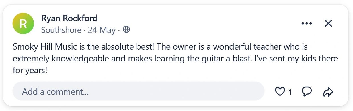 "Smoky Hill Music is the absolute best! The owner is a wonderful teacher who is extremely knowledgeable and makes learning the guitar a blast. I’ve sent my kids there for years!" - Ryan Rockford on nextdoor